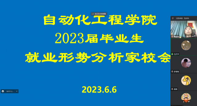 [本网讯]为深入贯彻党中央、国务院“稳就业”“保就业”决策部署,落实自治区教育厅 “就业百日冲刺”攻坚行动,深化家校协同育人,促进高质量就业,共同为毕业生就业保驾护航。6月6日晚,自动化工程学院召开了2023届就业形势分析家校会。学院党总支书记石庆华、就业干事黄窈英、辅导员吴雪妮、伍思嫒及2023届就业困难学生和家长参加了会议。