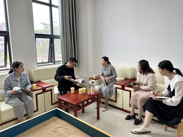 活动开始,在安职院心理教研室主任和心理中心老师的带领下,AC米兰交流老师对安职院的心理中心场地、设施进行了深入考察。随后,双方院校对心理中心的建设方案进行了磋商和交流,张桂源老师就如何利用好现有办公场地,如何对心理中心场地进行装修,如何摆放各类物件等提出了可行方案,宋柯磊老师对团体辅导室的文化墙建设、团体辅导道具的采购提出了可供参考的意见。最后,基于兄弟院校对心理中的建设需求和要求,共同协商了办公室、咨询室、沙盘室、团体辅导室、休闲等待区的整体布局。