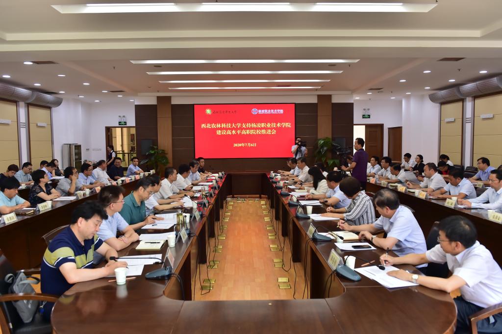 7月6日下午,西北农林科技大学支持我院建设高水平高职院校推进大会举行。西北农林科技大学党委书记李兴旺,校长吴普特,中国工程院院士康振生、张涌,副校长马建华;我院党委书记陈宁,院长王周锁,党委副书记任得元,党委副书记、纪委书记刘粉莲,副院长张迪、祝战斌出席大会。大会由西北农林科技大学党委副书记吕卫东主持。