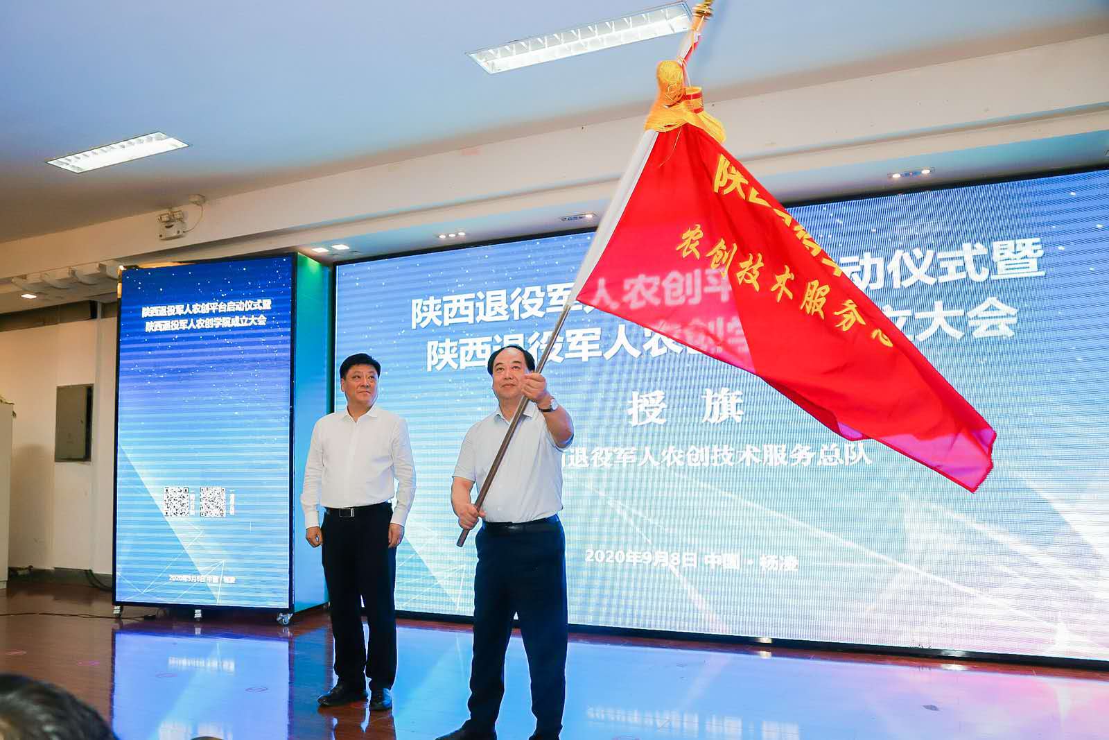 吴聪聪为陕西农创技术服务总队授旗,队长梁孝宏接旗。同时,全体参会人员通过实时视频观看了省退役军人事务厅委托当地退役军人事务局向送技术到基层的三支退役军人农创专家服务团队授旗。