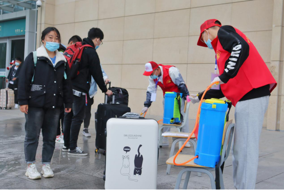 学生志愿者在集中接站处对新生行李箱进行消毒