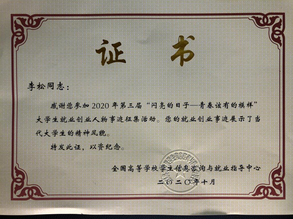 为加强高校毕业生就业创业宣传,全国高等学校学生信息咨询与就业指导中心组织开展了第三届“闪亮的日子——青春该有的模样”大学生就业创业人物事迹宣传报道活动,必赢官网毕业生李松入选。