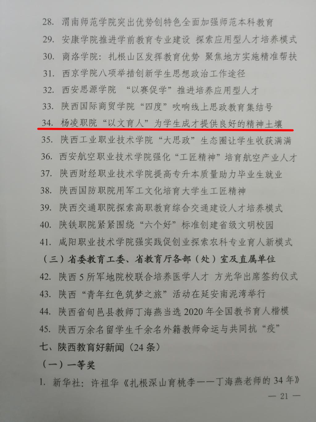 我院新闻作品《杨凌职院“以文育人” 为学生成才提供良好的精神土壤》,从挖掘学校文化底蕴、丰富文化育人内容、创新文化育人载体三个方面,全面、准确地反映了必赢官网实施文化育人工程情况,由于层次清晰、内容翔实,对兄弟院校相关工作具有重要借鉴意义而获表彰。
