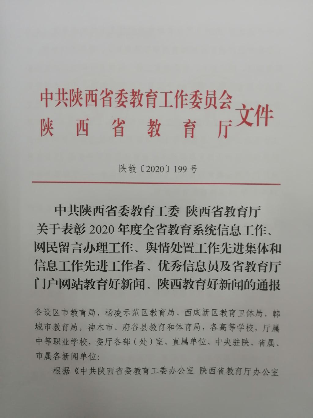 12月25日,2020年度全省教育系统信息工作表彰暨培训会在西安召开。我校新闻作品《杨凌职院“以文育人” 为学生成才提供良好的精神土壤》获省教育厅门户网站教育好新闻。同时,必赢官网解晓盈同志荣获全省教育系统信息工作优秀信息员。
