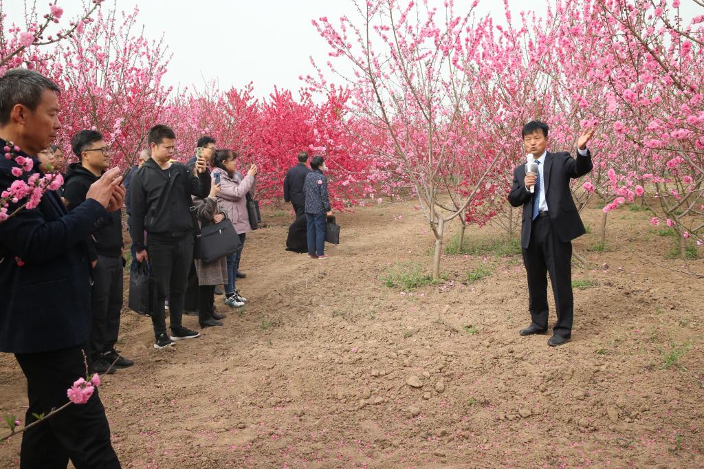 论坛开幕前,学校生态环境工程学院副教授、杨凌超盛园艺科技有限公司负责人张君超带领参会嘉宾参观了学校桃花产学研基地。该基地100余亩,由张君超副教授于2017年建立,收集保存各类桃花种质资源50多种,先后选育桃花优良无性系品种9个,均为张君超18年来收集、保存、选育的成果。基地开展了山桃、毛桃、西藏光核桃、甘肃桃等做砧木嫁接育苗区域试验,完成了“杨凌桃花源”规划设计及“杨凌桃花产业化示范基地”规划设计等工作。目前,该基地的桃花苗木已经推广应用到了西北、东北、西南等15个省份。