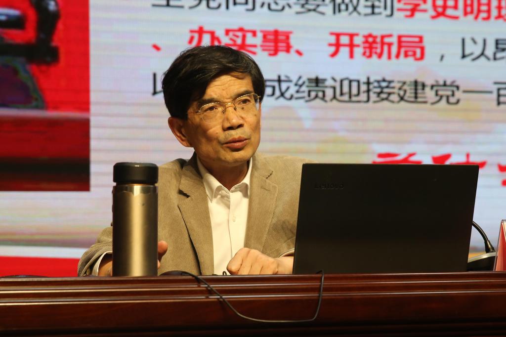 514日下午,学校在思辨堂举行党史学习教育专题报告会,邀请党史学习教育省委宣讲团成员袁武振教授作题为《中国共产党一百年的奋斗历程和基本经验》的专题讲座。党委副书记任得元主持报告会。