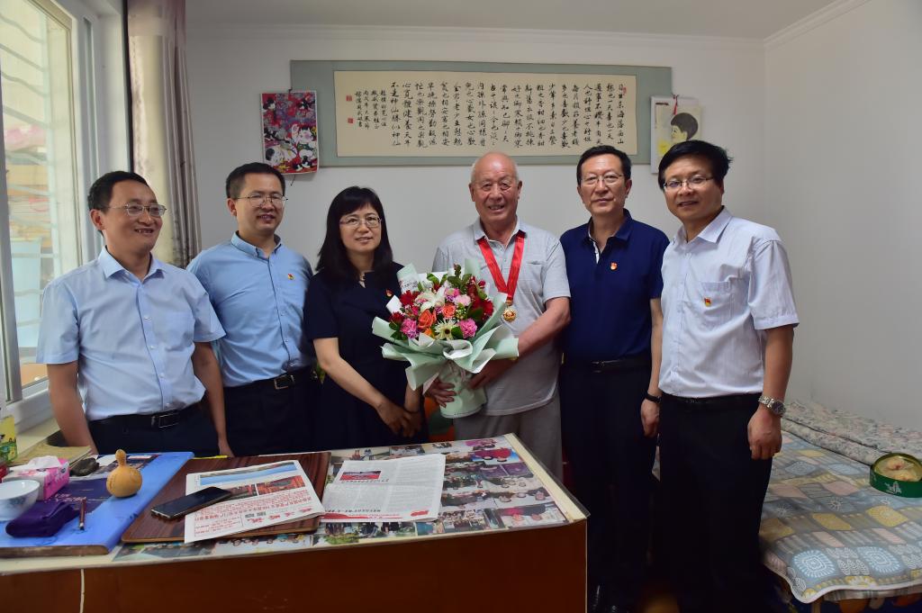 校领导一行来到吉殿威、刘修身、李安杰老党员家中,亲切与老党员们拉家常,关心询问老人的身体健康与生活起居等情况,叮嘱他们照顾好身体,一起回顾他们在党50年的光辉历程,聆听老党员在教书育人、学校建设历史中的奋斗故事,感谢他们始终忠于党的事业、践行党的宗旨、履行党员义务,默默为党和国家的事业做出贡献,并为老党员佩戴“光荣在党50年”纪念章,送上鲜花和慰问品。座谈中李安杰老师还动情地为大家朗诵了一首自己创作的诗词《水调歌头·七一》有感,表达对党的无限忠诚。