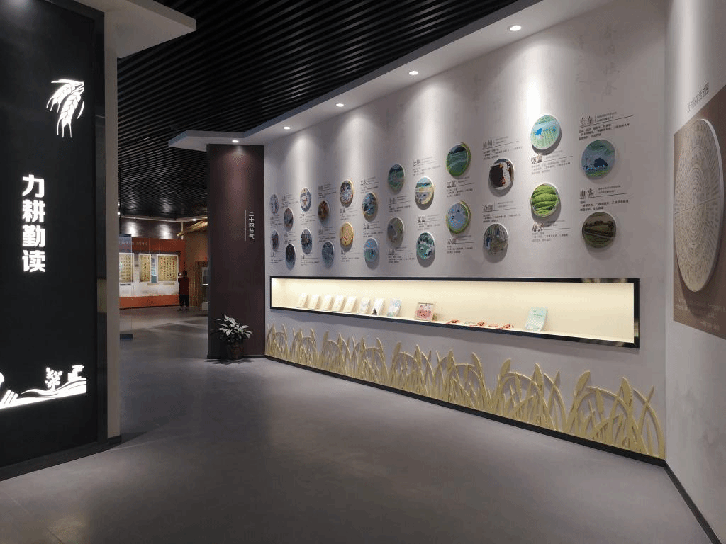 力耕勤读展厅作为展馆中的重点部分,以古木深色营造出了厚重的历史文化氛围,从言传身教、学字知事、边耕边读、乡绅表率、职业教育五个部分,系统展示了耕读文化的历史发展和文化传承。
