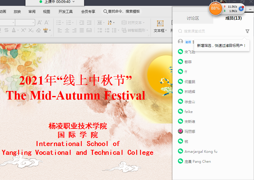 9月18日下午,在中秋节来临之际,学校针对全体国际学生举办“线上中秋节”文化活动国际学院副院长杨雪霁、相关教师、辅导员以及全体国际学生参加了本次活动。