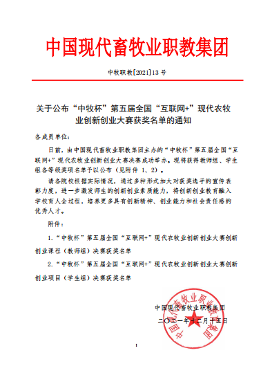 近日,在中国现代畜牧业职教集团主办的“中牧杯”第五届全国“互联网+”现代农牧业创新创业大赛决赛中,必赢官网荣获一等奖1项,二等奖1项,三等奖2项。