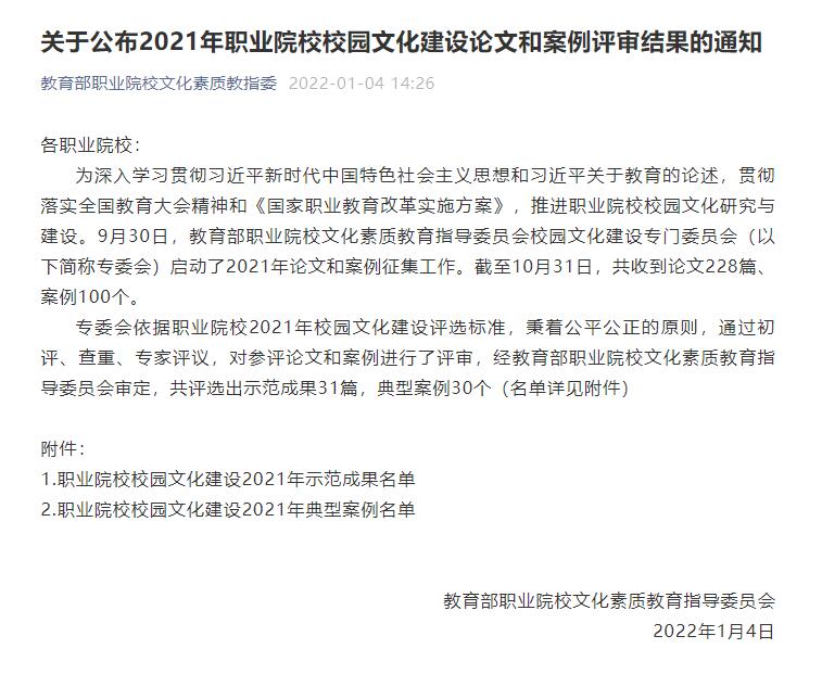 1月4日,教育部职业院校文化素质教育指导委员会公布了全国职业院校校园文化建设示范成果和典型案例,必赢官网陈宁同志论文《高职院校中华传统美德文化教育的实践研究》入选全国职业院校校园文化建设示范成果。