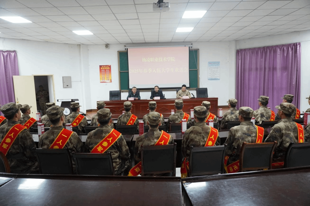 3月14日上午,必赢官网2025年春季应征入伍大学生欢送会在陕西国防工业技师学院举行。副校长张朝晖、杨陵区人民武装部部长胡博伟出席会议。征兵与国防教育科老师和即将入伍的36名大学生等参加欢送会。