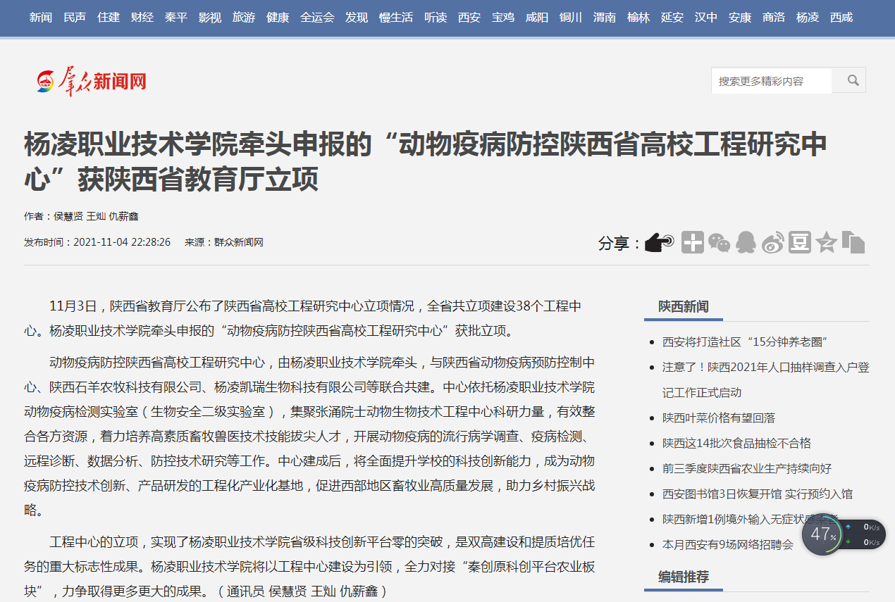 11月3日,陕西省教育厅公布了陕西省高校工程研究中心立项情况,全省共立项建设38个工程中心。杨凌职业技术学院牵头申报的“动物疫病防控陕西省高校工程研究中心”获批立项。