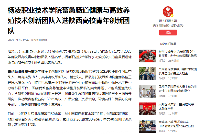 阳光讯( 记者 赵小康 通讯员 郭亚洲/文 崔晓/图 )8月29日,省教育厅公布了2023年度陕西高校青年创新团队入选名单,杨凌职业技术学院李龙教授牵头的畜禽肠道健康与高效养殖技术创新团队成功入选。