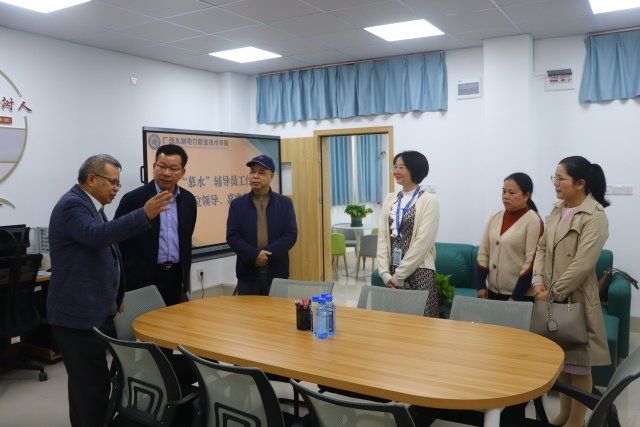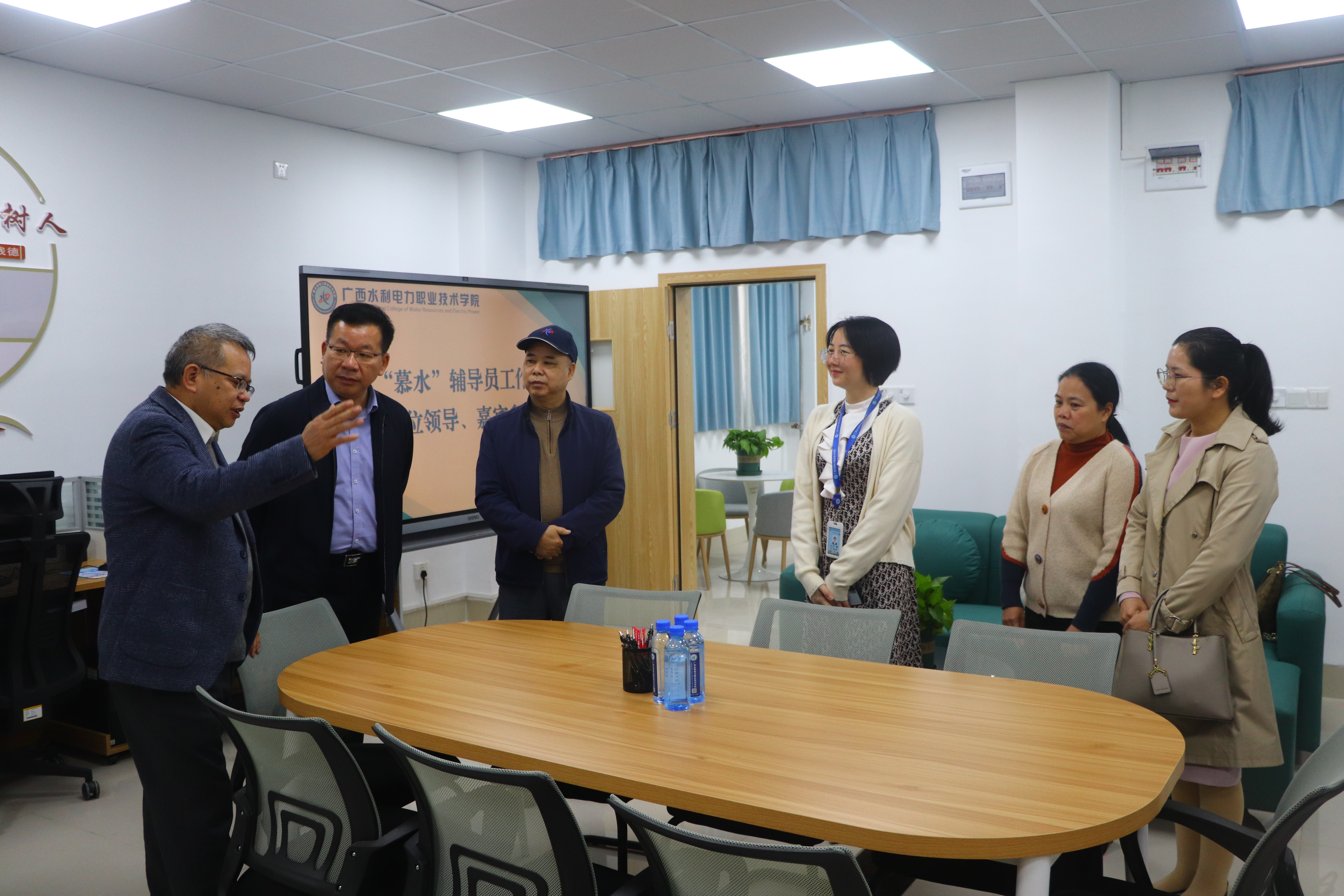 揭牌仪式后,李林校长、蒋文沛副校长、苏超副校长前往“慕水”辅导员工作室参观指导。
