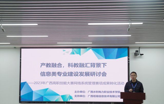 本次研讨会由信息工程学院与广西塔易信息技术有限公司共同协作组织。会上,学校刘存香副校长发表致辞,他希望校企双方能够推进交流与合作,实现优势互补、资源共享,积极深化产教融合与人才培养改革,在职业教育现代化发展中拿出更多系统性、突破性、引领性的改革创新成果。