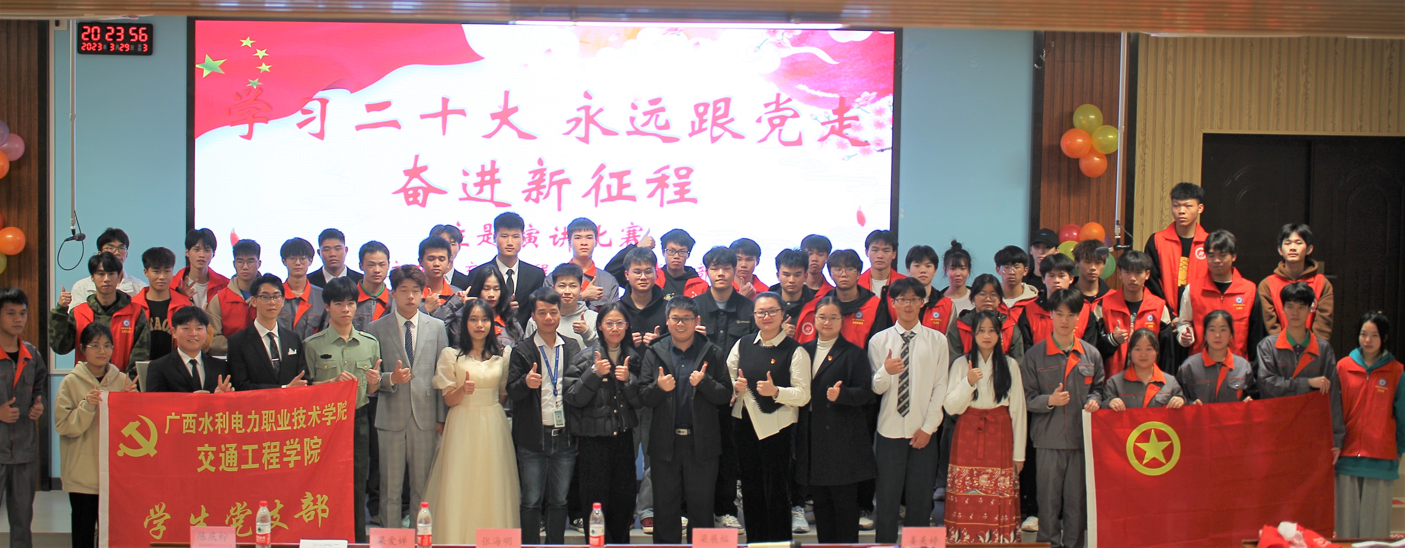 [本网讯]为了推动党的二十大精神学习贯彻走深走实,不断激发广大青年学生勇担时代使命,阔步复兴征程的激情和活力,3月29日,交通工程学院团委联合学生党支部在里建校区教学楼阶梯201教室开展了“学习党的二十大,永远跟党走,奋进新征程”主题演讲比赛。交通工程学院党总支书记张海明、学生党支部书记梁展榕、分团委副书记梁爱婵以及辅导员代表担任了此次比赛的评委,学院各班学生代表共100余人观看比赛。