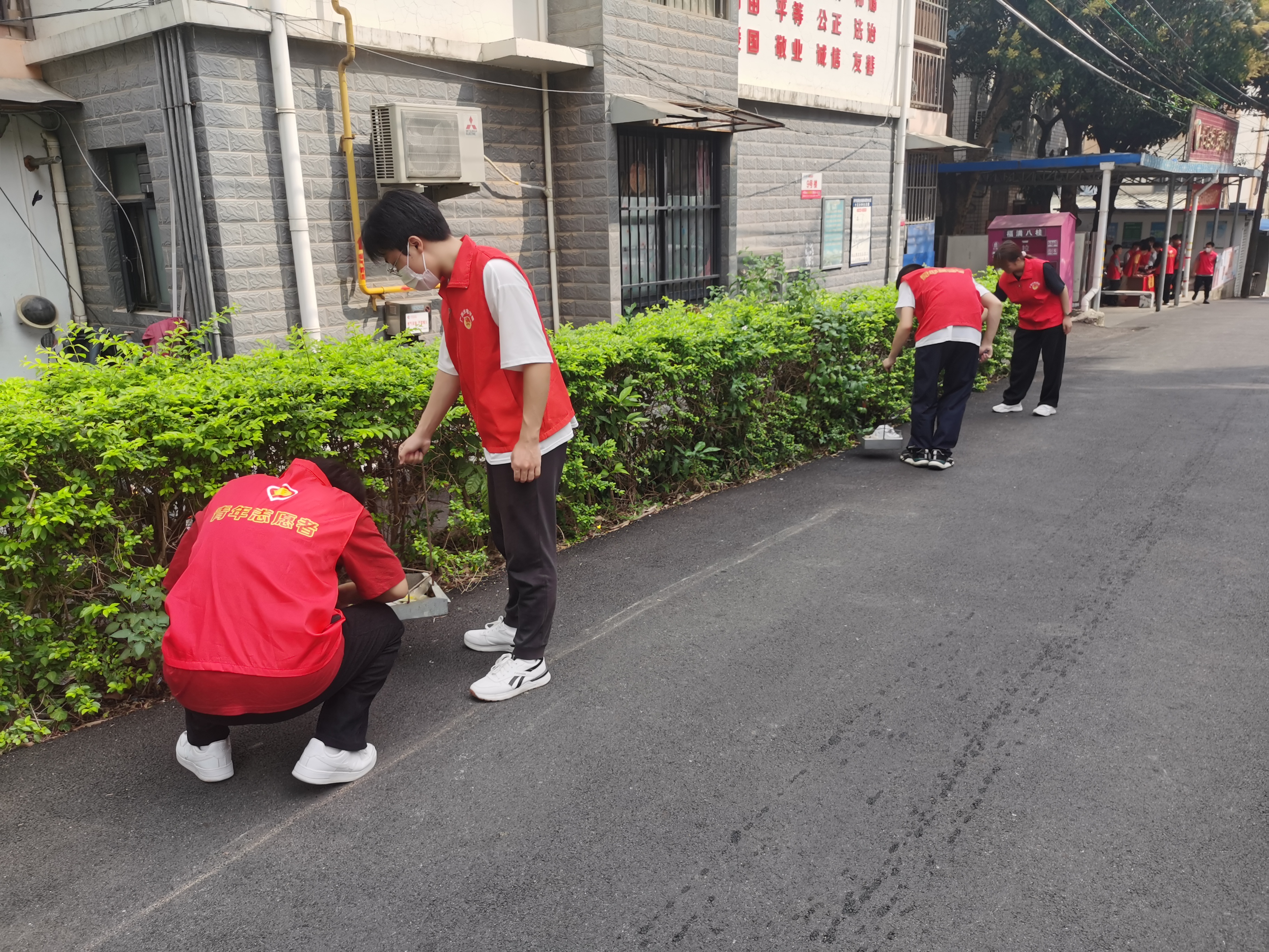 清洁社区活动中,党员同志和青年志愿者们对路边绿化带里难以清洁的顽固角落进行了彻底的清扫,对各楼栋墙上的小广告进行了清理,社区卫生环境得到进一步提升。