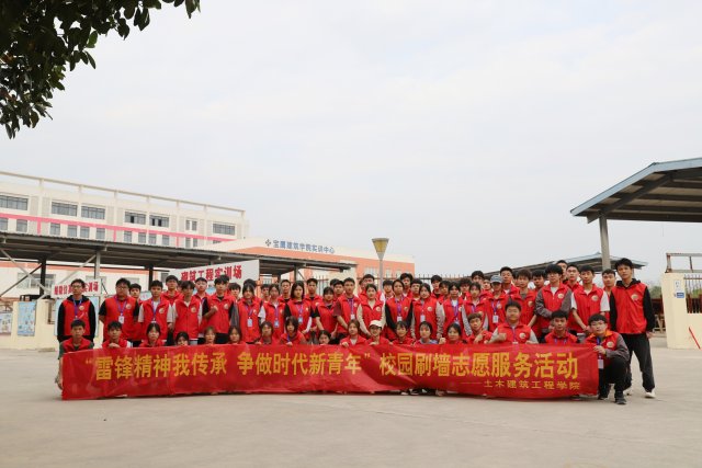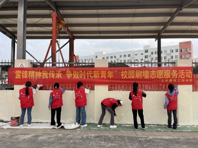 [本网讯]为深入学习贯彻落实党的二十大精神,认真学习贯彻习近平总书记关于弘扬雷锋精神的重要论述,传承“奉献、友爱、互助、进步”的志愿精神。3月10日下午,土木建筑工程学院学生党支部、学院团委、鲁班建筑技术服务队联合劳动育人辅导员工作室,在里建校区建筑实训场内开展“雷锋精神我传承 争做时代新青年”校园刷墙志愿服务活动。活动由学院团委副书记梁春艳老师、劳动育人辅导员工作室教师代表陈昌世老师以及70名学院志愿者们共同参加。