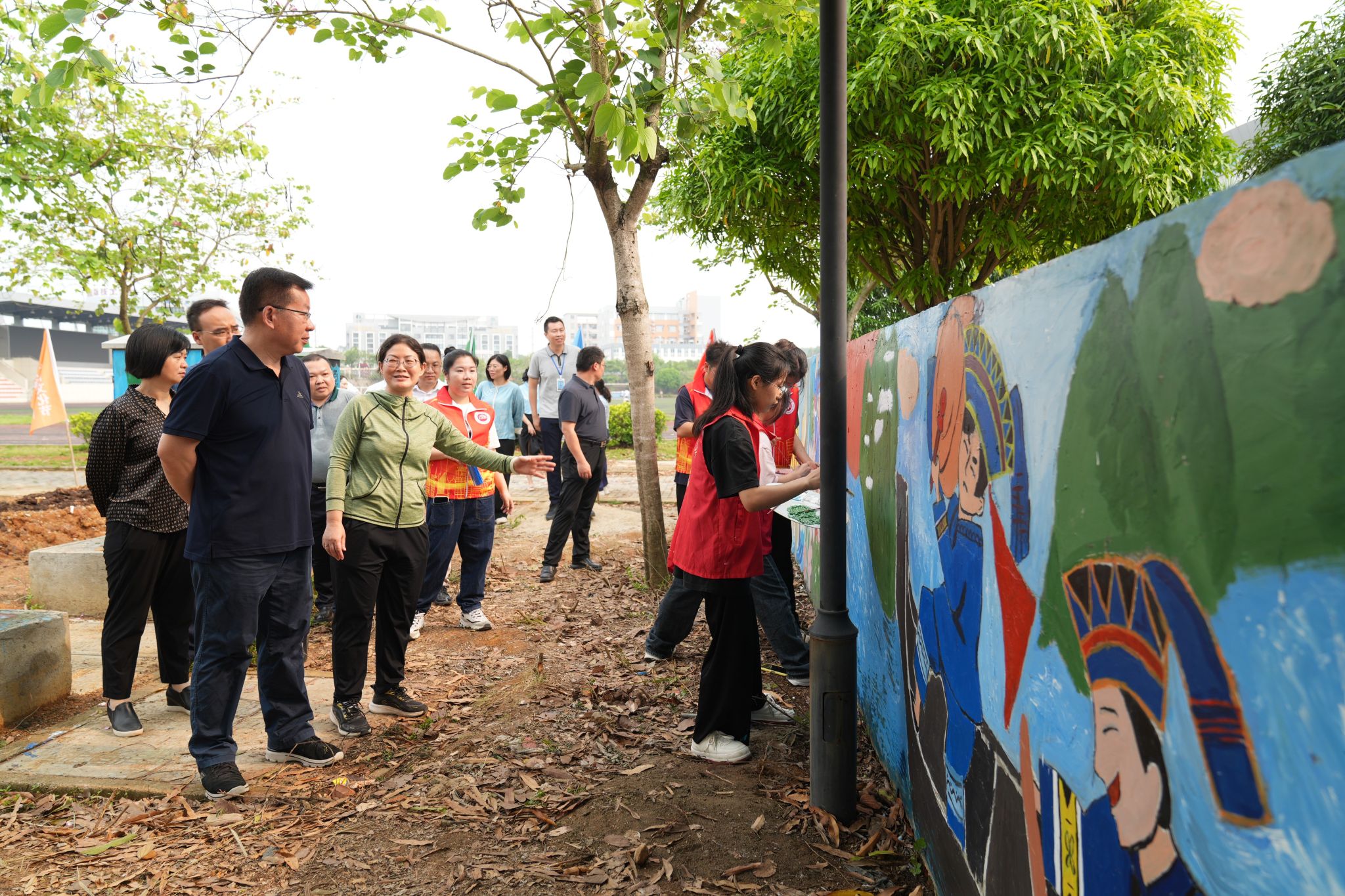 仪式结束后,李林和师生一起参观了由建筑工程学院学生绘制的彩绘文化墙。一幅幅画展现着民族风情,整面墙成就了一道和美的乡村风景。不仅装点着劳动教育实践基地,也在潜移默化中传递着知识、文明与自信。