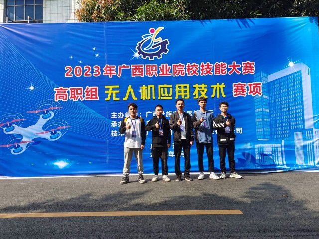 2023年3月20日,广西职业院校技能大赛高职组《无人机应用技术》赛项在广西现代职业技术学院举行。由21机器人2班莫泽勇、22机制2班刘荣佳、22机器人2班文礼瞳和22机器人2班陈祯威4名同学组成的学校代表队,在黄胜存和李兼伐两位老师的指导下,经过比赛现场激烈比拼,最终学校代表队获得该赛项二等奖。