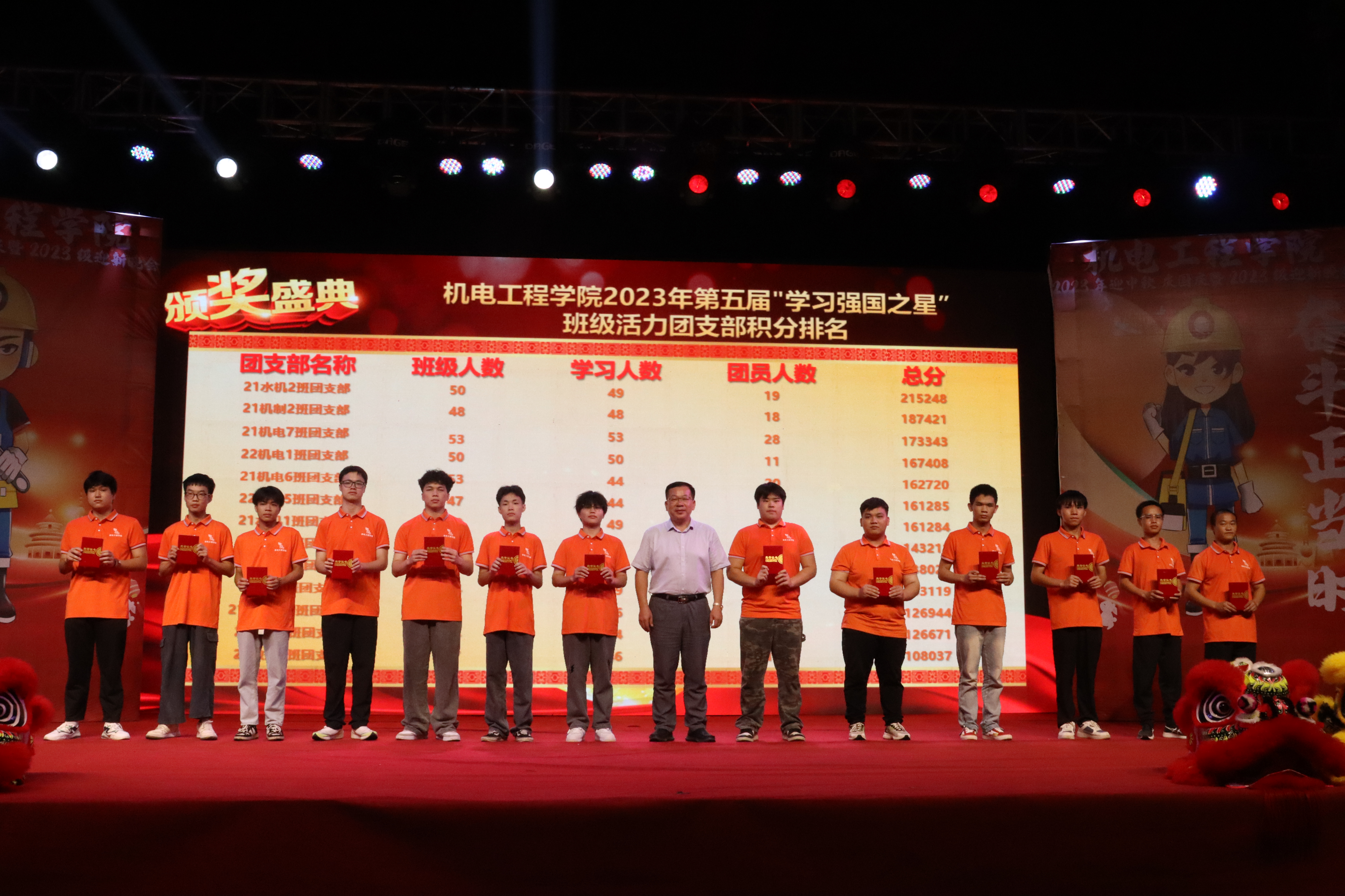 学校校长李林出席晚会,并为机电工程学院第五届“学习强国活力团支部”颁奖。此次晚会分为三个篇章,分别为“青春心向党”“花好月圆夜”“家国万里情”,共计20个节目。晚会在学校龙狮协会带来的《醒狮迎新》节目的锣鼓声中拉开帷幕,节目形式多样,有退役士兵复学大学生带来的风采展示《渴望光荣》;有武术表演《功夫小子》;有老师和学生联袂带来的小合唱《感恩的心》;有汉服秀《霓裳羽衣》;有由机电工程学院老师们带来的民族服装展示《最炫民族风》;也有热情洋溢的街舞、乐队演出及优美的舞蹈《万疆》等彰显中华优秀传统文化及青春现代类的节目。