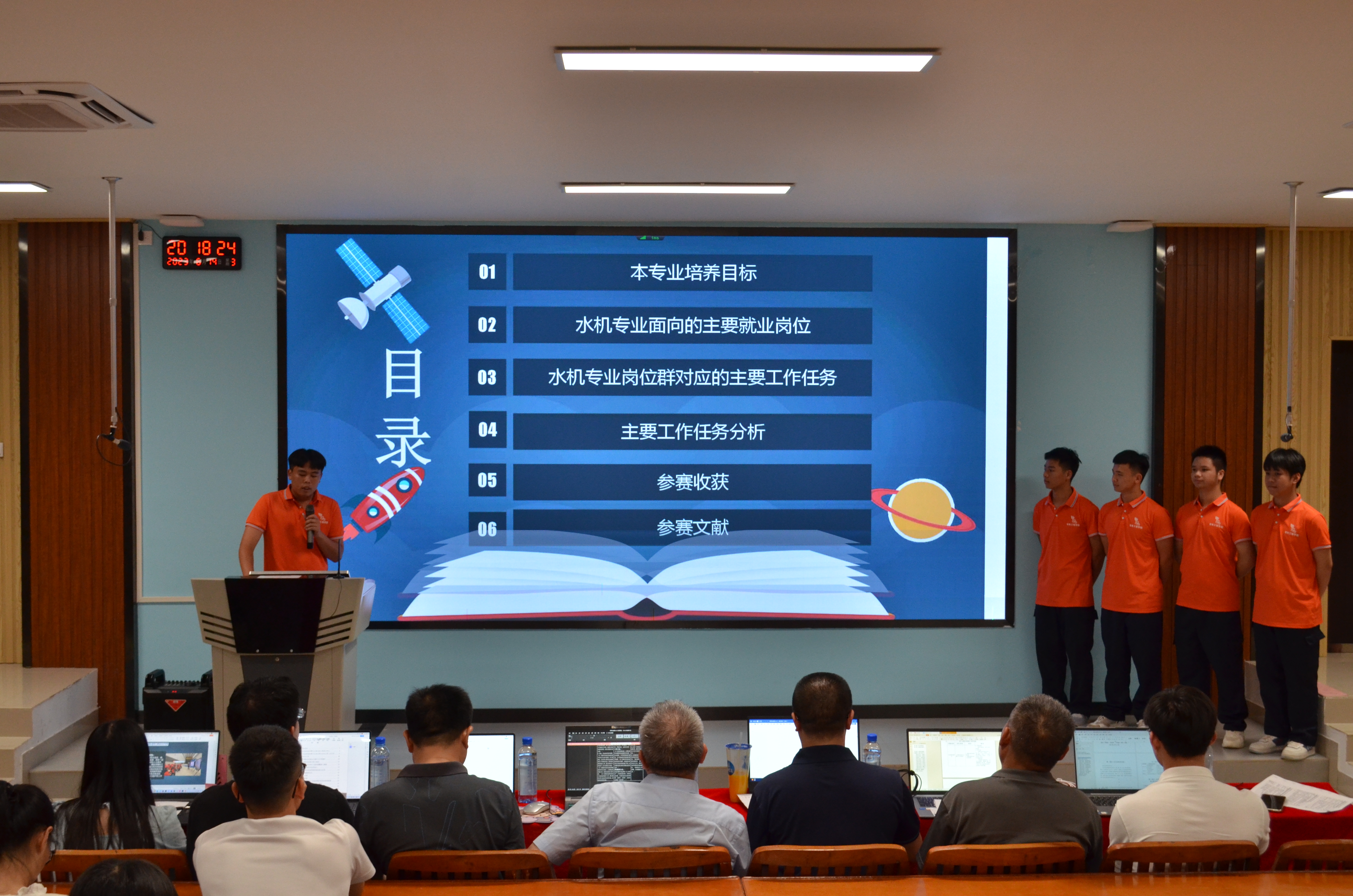 决赛现场,各学院队伍分别围绕职业(专业)培养目标、专业面向的主要就业岗位、专业岗位群对应的主要工作任务、主要工作任务分析、参赛收获、参考文献六个方面进行系统阐述,评委老师根据参赛队伍准备的职业(专业)认知word文档、PPT、工作任务视频、主讲人演讲以及参赛队伍的答辩情况综合评分。经过紧张有序地比赛。