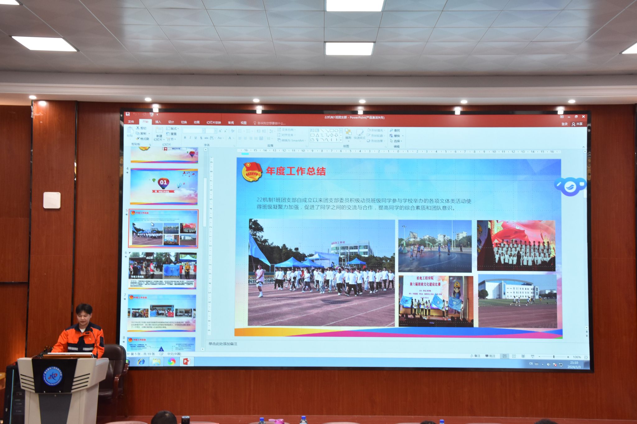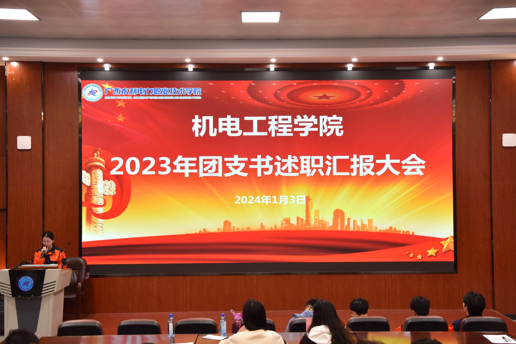 [本网讯]为深入贯彻落实全面从严治团的要求,激发基层团组织活力,压实基层团支部书记责任,2024年1月3日晚,机电工程学院团委在里建校区教学楼二楼报告厅举办2023年度团支书述职汇报大会,学院团委书记韦微、团委副书记黄泳斌、辅导员代表参加会议,45个班级团支书进行述职,各班团支部委员及团员代表共计270人参会。