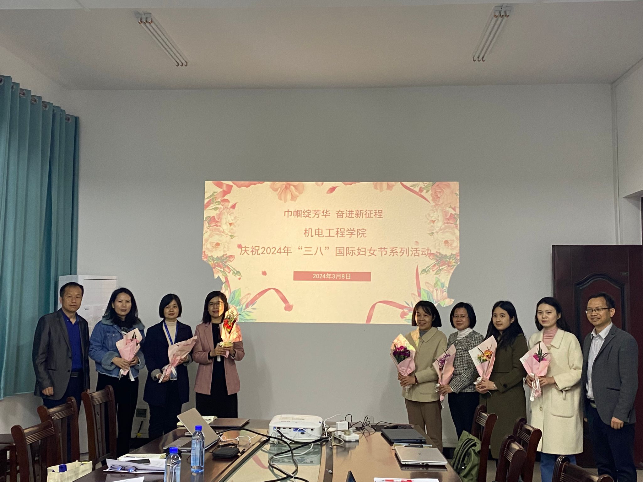 本次活动在学校长堽、里建两校区同时进行,在长堽校区机电工程学院会议室,学校党委副书记侯宗毅和机电工程学院院长陆尚平给女教职工们送上了鲜花与祝福;在里建校区,女教职工们在鲜花和祝福声中欢度节日。温馨的祝福和贴心的礼物,给女教职工们带来了节日的惊喜和欢乐。