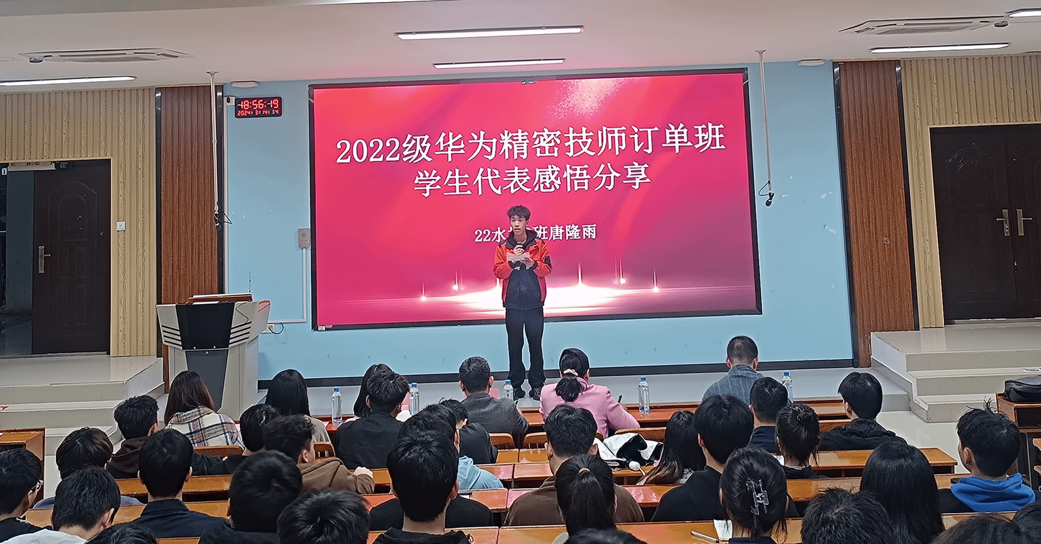 [本网讯]为帮助信鸿华为精密技师订单班同学全面总结上学期末到企业开展企业实践的经验,同时帮助信鸿华为设备技师订单班的同学对企业有进一步的了解,进一步发挥就业育人实效,3月14日晚上18:30,机电工程学院举办2022级华为订单班实习经验分享会,学院院长陆尚平、党总支书记杨青出席,22级、23级各班辅导员信鸿华为精密订单班、技师订单班全体同学共计130余人参会。活动由信鸿华为精密订单班班长唐隆雨同学主持。