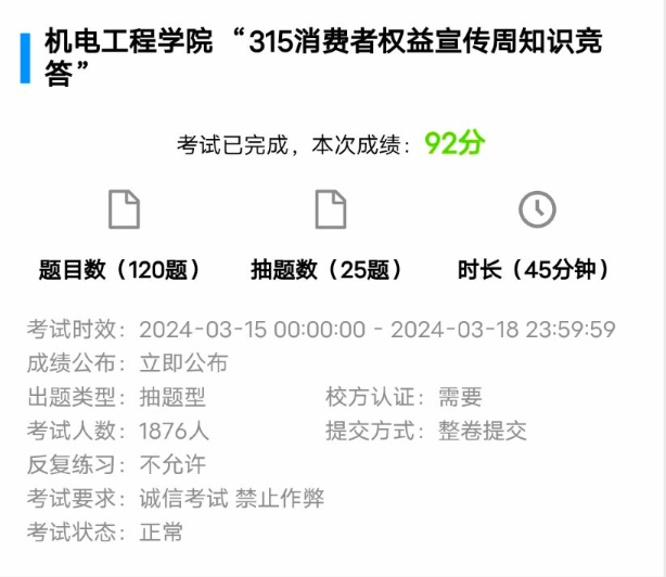 本次活动以“共筑诚信 共享安全”为主题,以线上和线下的形式同时进行,线上活动利用易班APP开展竞答活动,学生登录易班APP找到相应推文《机电工程学院2024年3·15消费者权益保护宣传周知识竞答》进行答题。活动期间,全校共计1876人参与答题。线下通过开展权益知识有奖问答、设立学生信息反馈点、真假辨别等有奖小游戏,让同学们赢得奖励的同时了解到更多与权益相关的知识。