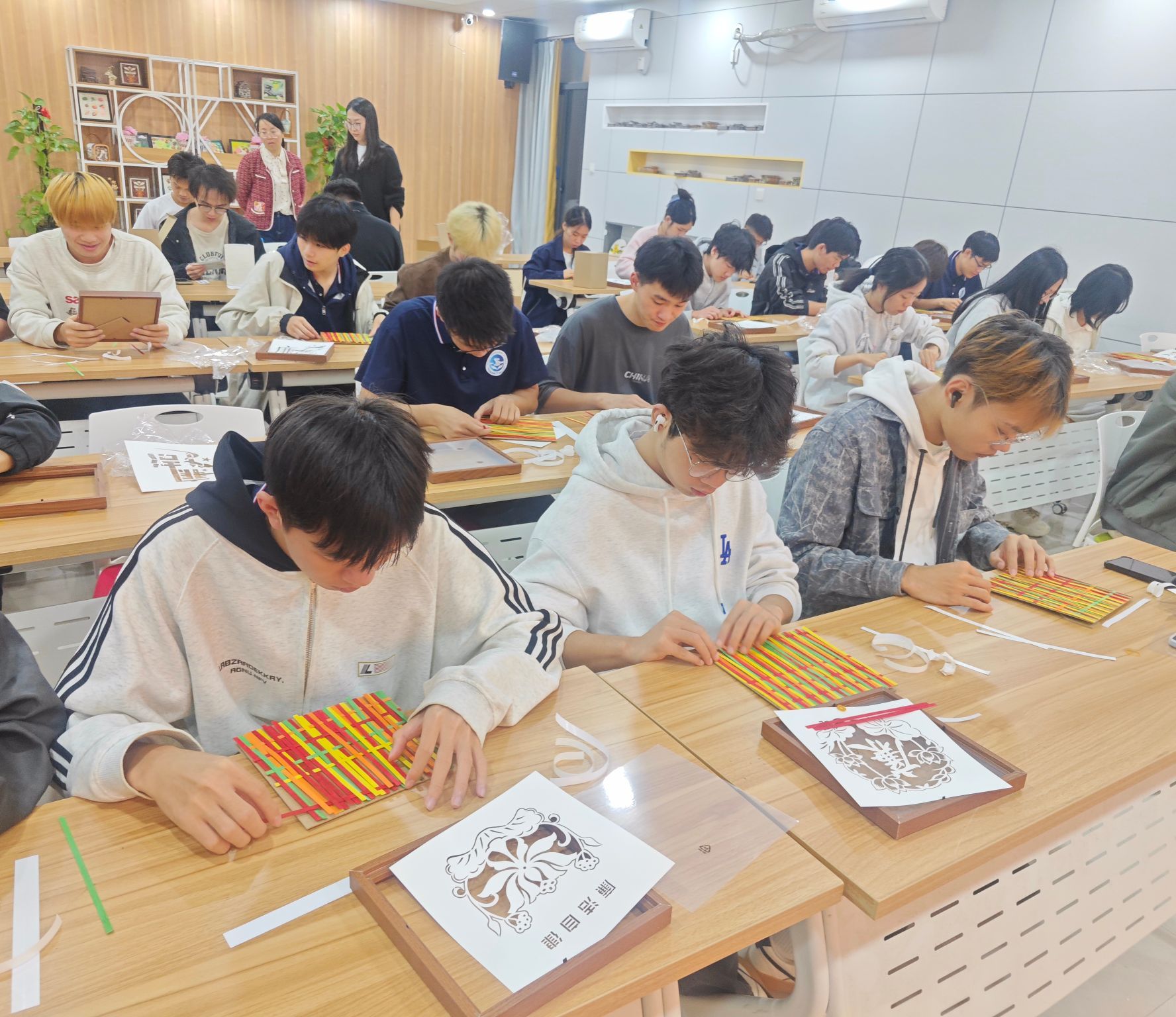 学生在制作竹编画