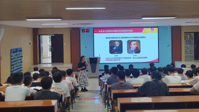 [本网讯]为深入开展学习贯彻习近平新时代中国特色社会主义思想主题教育,进一步提高青年教师的教学能力,全面提高思政课教育教学质量,5月16日上午,马克思主义学院在里建校区阶梯102教室开展青年教师展示课活动。本次展示课主讲人为2022年刚入职的韦东荣老师,授课班级为电气自动化技术3/4班,马克思主义学院8位专职教师参与听课、评课。