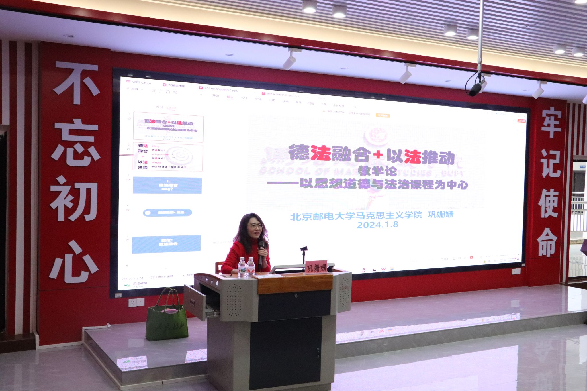 巩珊珊博士结合自身专业研究方向,以《思想道德与法治》课程为依托,分三个部分阐述如何在课程中进行德法融合。第一部分,巩博士分别梳理《思想道德与法治》课程的发展进程和社会主义法治建设的发展进程,分析两个进程的关联。第二部分,巩博士介绍北京邮电大学马克思主义学院如何搭建思政课实践教学平台。第三部分,巩博士以自己的课堂为例,分章节详细说明如何在课堂上将时事热点与法律文件相结合,进行德法融合。整个讲座信息量大、与教学实践结合紧密,有很强的方法论意义,老师们很受启发。