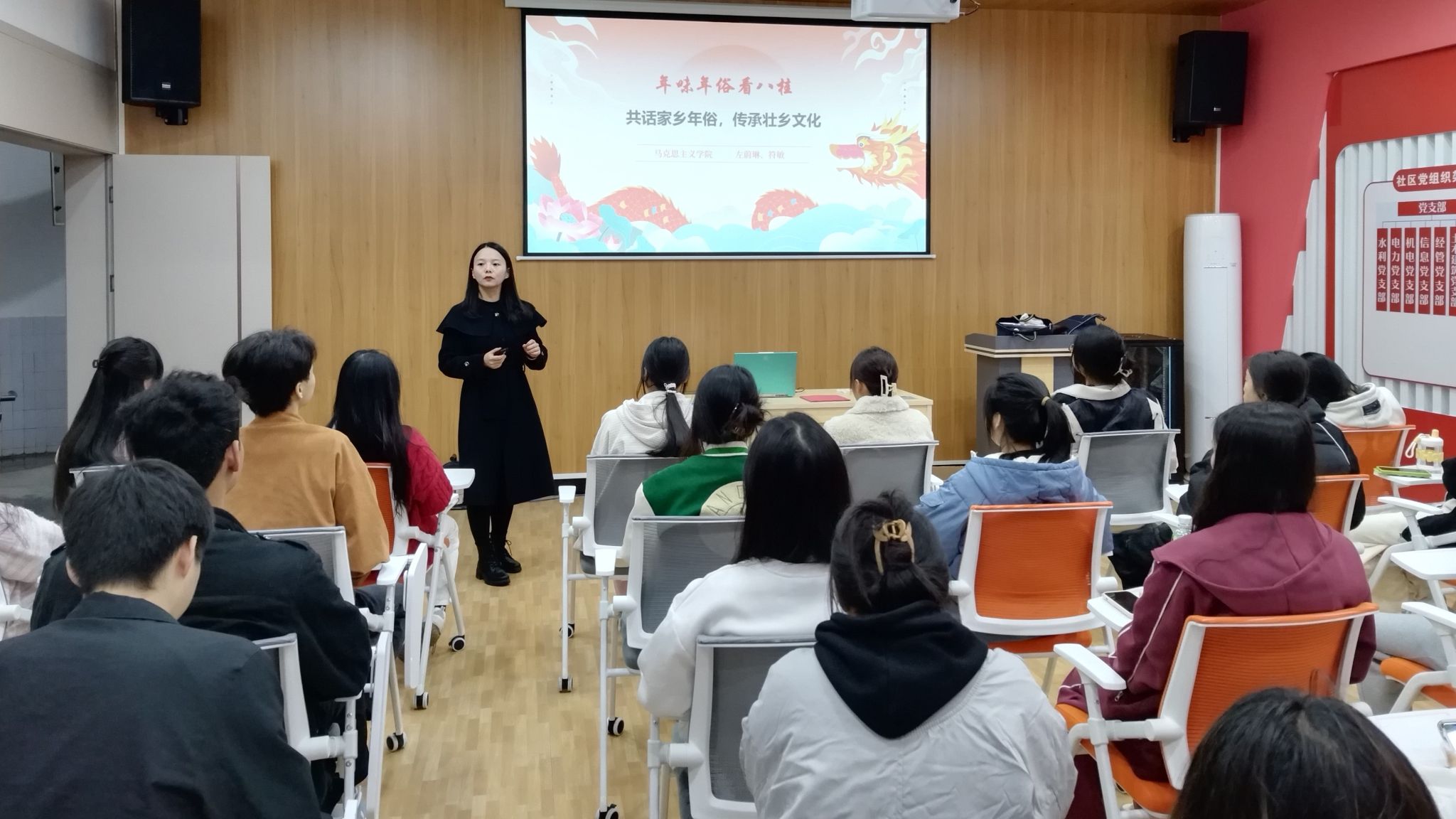 [本网讯]为深入学习贯彻习近平文化思想,推动中华优秀传统文化创造性转化和创新性发展,深挖民族节日文化的丰富内涵,坚定文化自信,3月13日,马克思主义学院教师左蔚琳、符敏在长堽校区“一站式”学生社区组织开展传承中华民族优秀传统文化主题活动之“年味年俗看八桂——共话家乡年俗 传承壮乡文化”。来自经济管理学院、信息工程学院的40名同学参加了本次活动。
