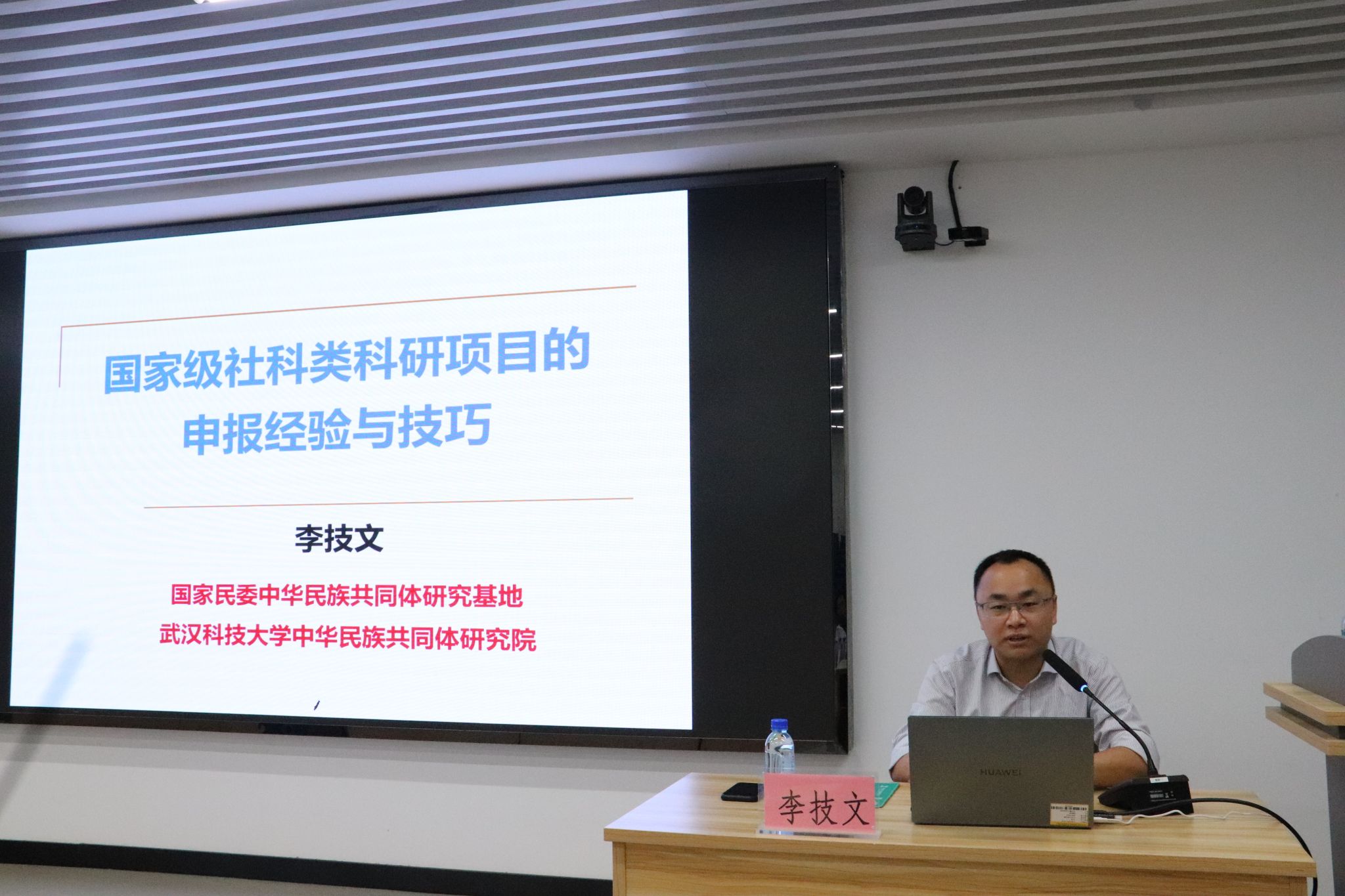 在上午的讲座中,特邀武汉科技大学中华民族共同体研究院特聘教授、国家民委中华民族共同体研究基地副主任李技文博士主讲,李技文博士首先强调了课题申报对于教师个人成长和发展的重要性,并指出写好申报书是课题申报的关键。接着,他从“选好题——课题申报的灵魂”“精论证——课题申报的基石”“重细节——课题申报的关键”三个方面进行了深入细致的讲解,李技文博士还结合自己多年的课题申报经验,分享了非常实用的申报技巧和注意事项。讲座后,李春萌为李技文博士颁发了“马克思主义学院客座教授”聘书。