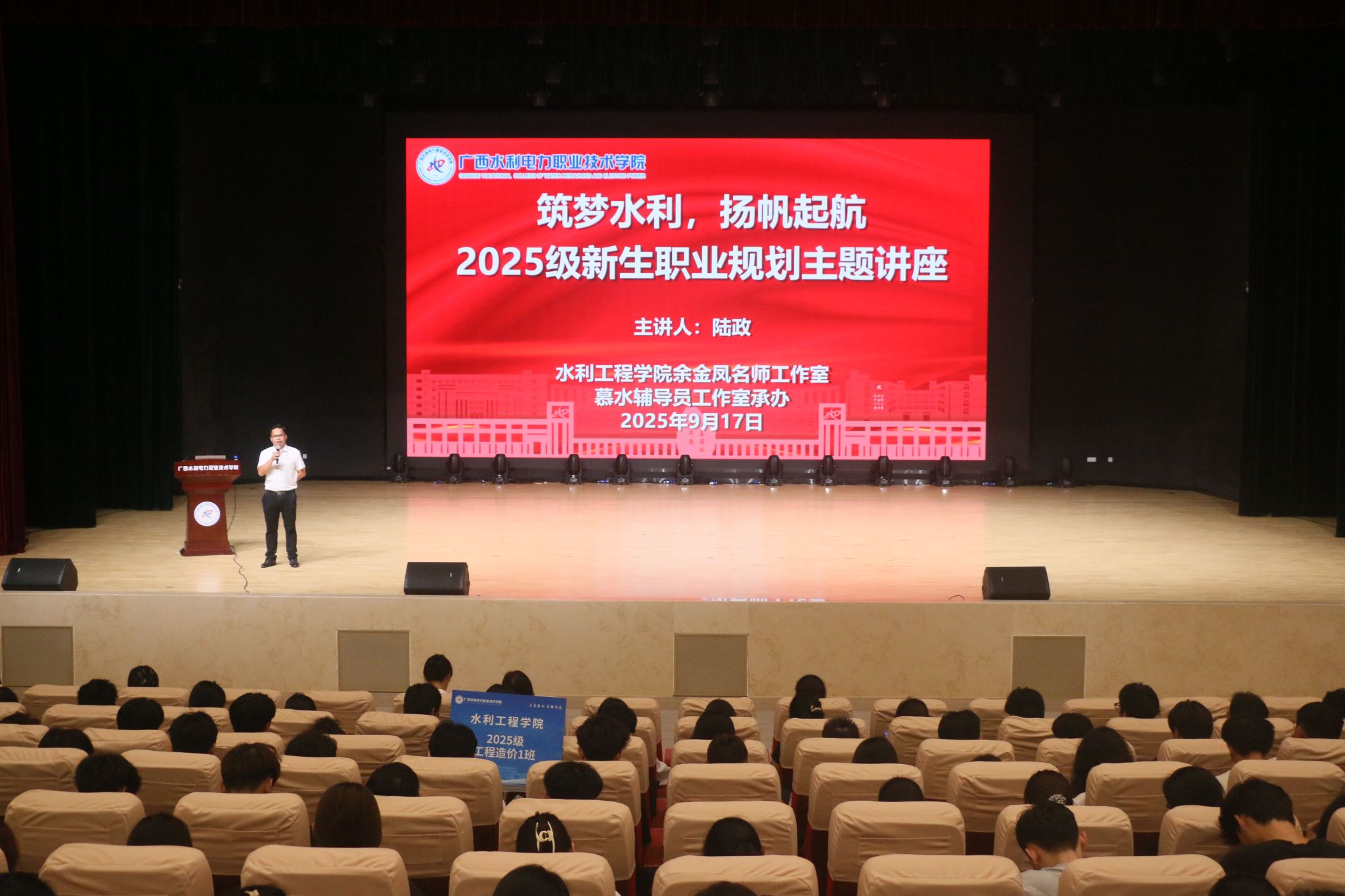[本网讯]9月17日下午,为帮助2025级新生快速适应大学学习生活节奏,初步了解自己所选专业学习实践内容、就业方向、成长路径,我院面向2025级新生分专业举办了“筑梦水利,扬帆起航”——职业生涯规划讲座。我院特别邀请05级水利水电建筑专业扎根基层、砥砺前行的优秀校友——陆政学长,为2025级新生们勾勒出清晰的职业成长路径。本次讲座由水利工程学院余金凤名师工作室、慕水辅导员工作室承办。