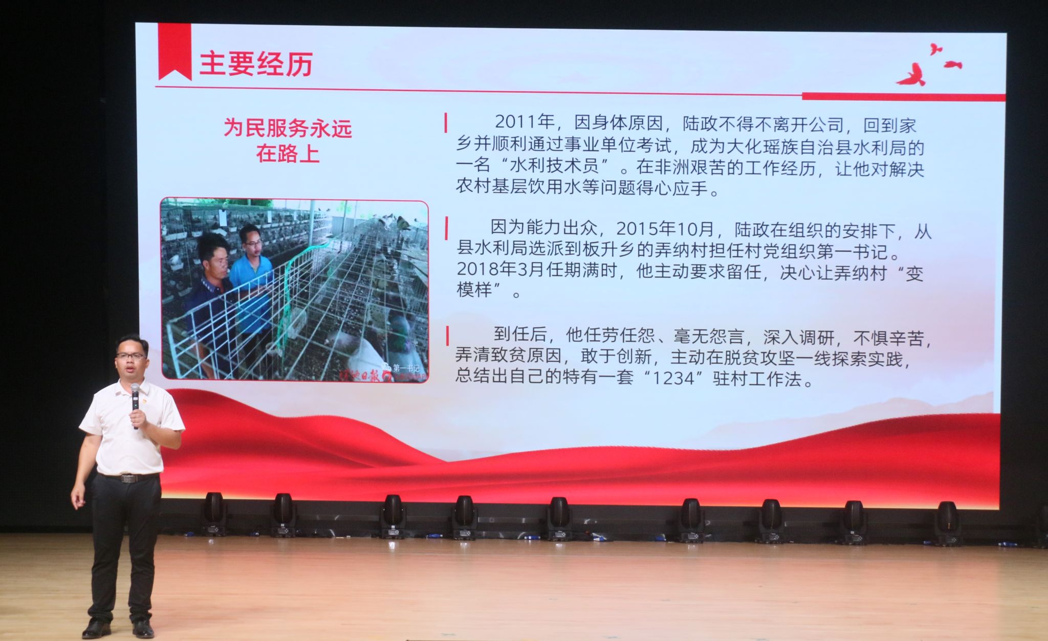 陆政还分享了自己的成长经历:在校期间为巩固专业知识技能,创办“水利科技协会”,充分利用课余时间带领协会成员进行备赛训练,代表学校参加全国水利高职院校技能大赛等竞赛,并在CAD等赛项中取得了优异成绩。同时拓展工程造价知识并参与实际项目。毕业后广西电力工程建筑公司安哥拉国工业园区项目部,以卓越管理能力获外方好评。2011年,由于身体原因,陆政不得不离开公司,回到家乡并顺利通过事业单位考试,曾任大化瑶族自治县板升乡弄纳村第一书记、大化瑶族自治县水利局党组成员、建设站站长。积极为群众排忧解难,为群众做好事、办实事、解难事,用真情实干取得民心,用实绩赢得广大群众的信任和支持。