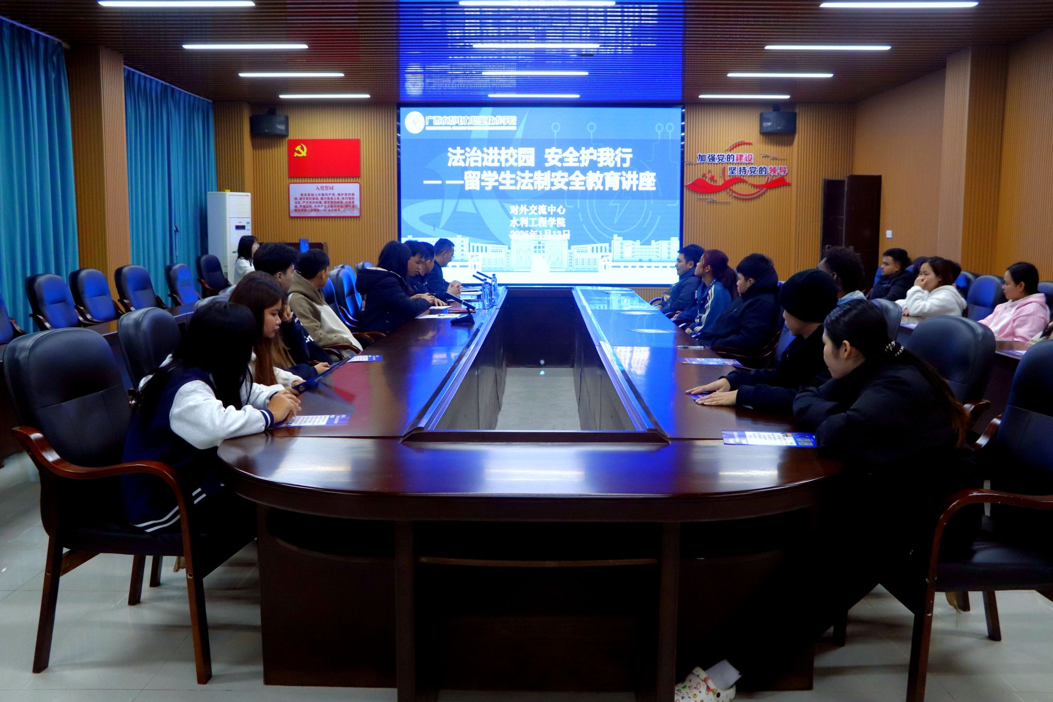 [本网讯]为进一步增强在校留学生的法律意识和自我保护能力,营造安全、和谐、法治的校园环境,1月13日,对外交流中心特邀南宁市公安局广西—东盟经济技术开发区(南宁华侨投资区)分局刑事侦查大队警官刘秭卿,在里建校区水工实训楼B202为里建校区全体留学生带来“法治进校园 安全护我行”留学生法治安全教育专题讲座。水利工程学院副院长张宪明、留学生辅导员出席了本次活动。“慕水”辅导员工作室协办。