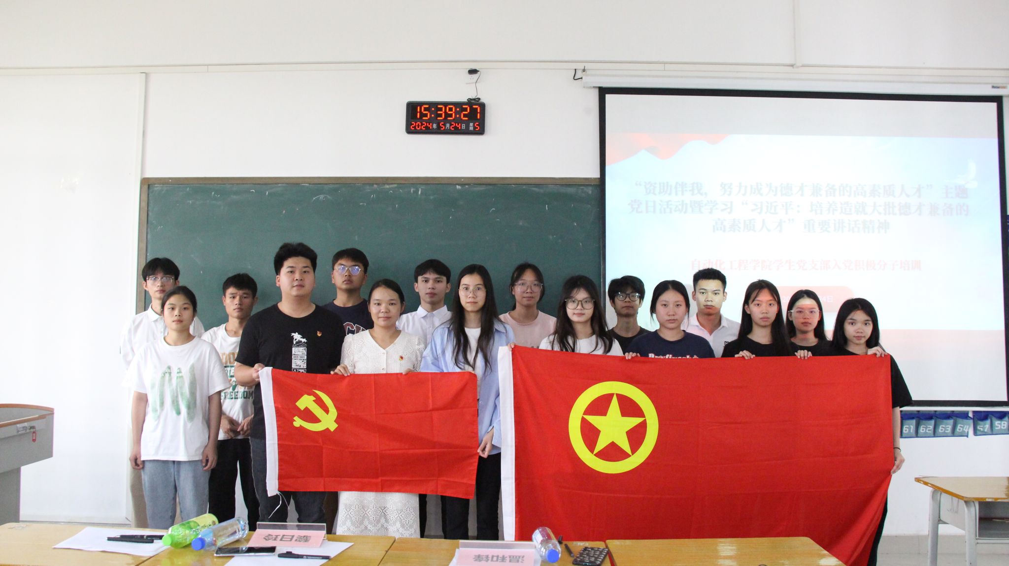 【本网讯】5月24日,自动化工程学院学生党支部及团委联合举办了意义深远的受奖助学生优秀事迹报告会。学院辅导员代表温和锋老师和黎日玲老师参加会议,与学院入党积极分子、发展对象共同倾听优秀学生事迹分享。
