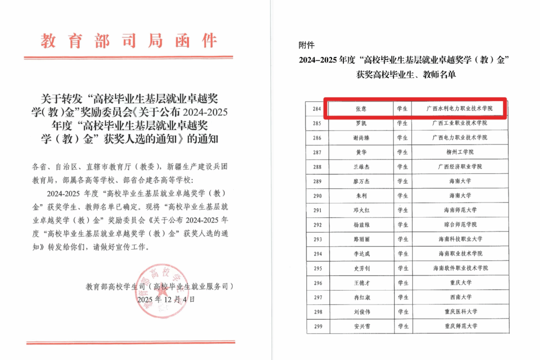 据悉,全国“高校毕业生基层就业卓越奖学(教)金”由教育部高校学生司(高校毕业生就业服务司)、教育部学生服务与素质发展中心共同指导,中国长江三峡集团出资,中国教育发展基金会特设,旨在鼓励高校毕业生赴基层就业创业,表彰优秀毕业生和教师。经各地评选推荐,2024-2025年度全国共奖励418名毕业生,其中广西13人。